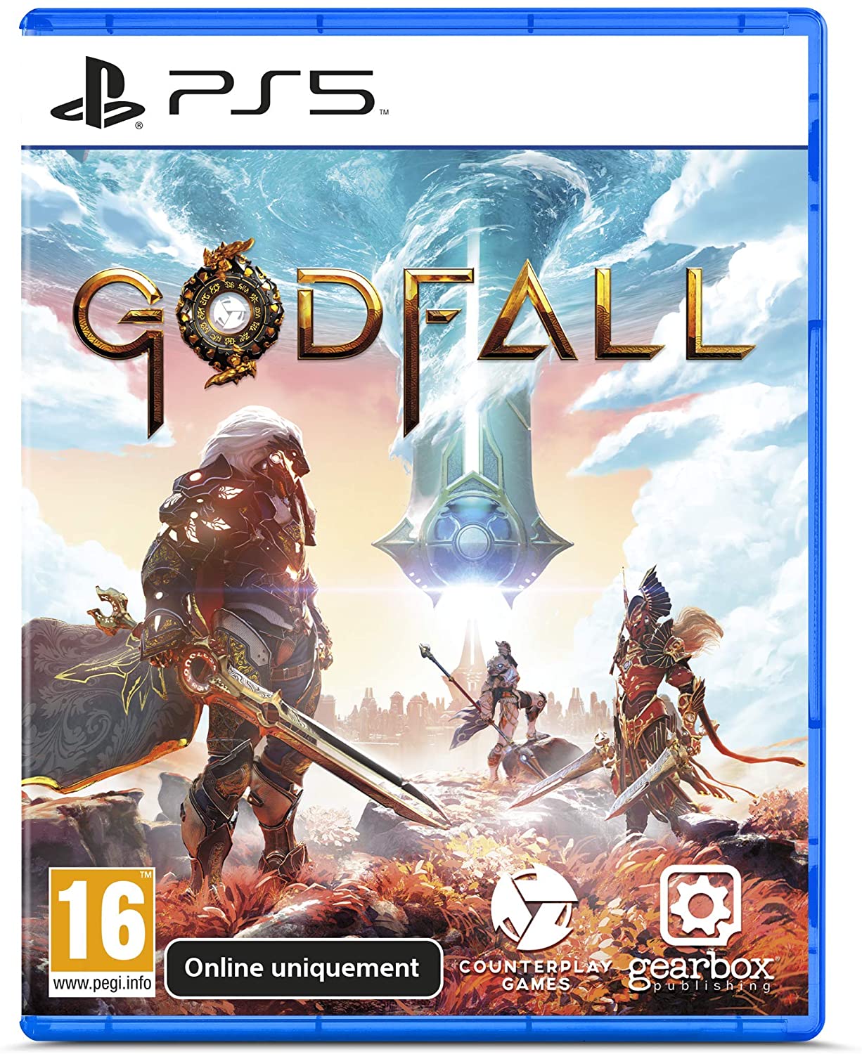 Aperion est au bord du précipice. Vous êtes le dernier des chevaliers Valorian, des guerriers divins capables d’équiper des Valorplates, des ensembles d’armures légendaires qui transforment leurs porteurs en maîtres imparables du combat au corps à corps. Ne faites qu’une bouchée devos ennemis en grimpant dans chacun des royaumes élémentaires et défiez le dieu fou, Macros qui vous attend au sommet. Elevez-vous dans Godfall, le premier jeu d’action-RPG de mêlée au corps à corps.Libérez la puissance de votre PlayStation 5 avec des temps de chargement quasi-nuls. Ressentez le choc des épées et le frisson de la bataille grâce à l’intégration de DualSense. Aventurez-vous à travers des panoramas exotiques, des récifs aériens du Royaume de L’Eau aux forêts souterraines pourpres du royaume de la Terre. Maîtrisez les 5 classes d’armes, chacune avec des styles de jeu uniques et une variété d’épées à deux mains, d’armes d’hast, de marteaux de guerre, d’épées longues et àdoubles lames. Montez les niveaux, apprenez de nouvelles compétences et découvrez des armes légendaires aux effets dévastateurs sur le champ de bataille. Débloquez 12 Valorplates: des armures divines inspirées du zodiaque qui vous permettent de détruire tous les ennemis entre vous et Macros. Testez vos compétences dans la Tower of Trials et défiez-vous vous-même contre les ennemis les plus coriaces et gagnez un butin de premier ordre. Combattez en solo ou aux côtés d’amis dans un jeu en co-open ligne à joueurs PvE.   L’édition Ascended contient: le jeu de base l’extension 1 (sortie prévue en 2021) Gold Valorplate Skins (Silvermane, Phoenix et Greyhawk) Orange Vertigo Valorplate Skin Gold Weapon Pack Gold Shield Gold Royal Banner Zodiac Knight Lobby Title